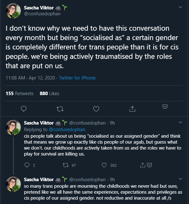 There has been an underlying assumption that I’ve encountered talking to people that I was socialized as female, not male. I don’t feel that at all. Other people were able to “fit into” the assigned social role, perhaps the dysphoria didn’t impact them as young as it did me. The author of this tweet is correct – we all have different experiences. We experienced ourselves uniquely as young people; we may or may not have been able to hide ourselves in a shell of a gender that didn’t match who we are; the families we had may have supported us or abused us. Our peers likely bullied us. Our teachers humiliated us. Our experience does not match that of our cis peers. At. All.