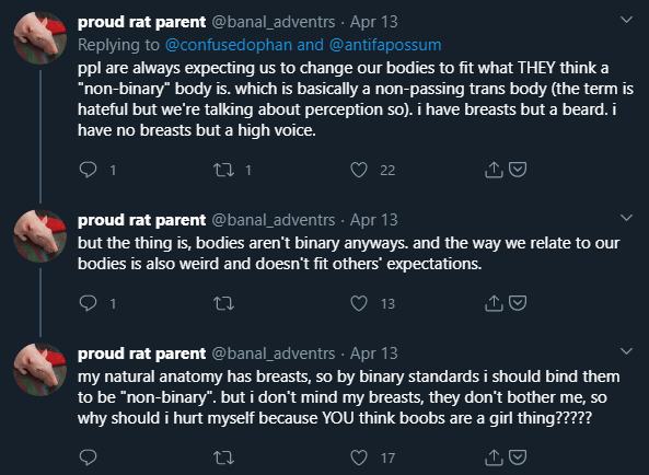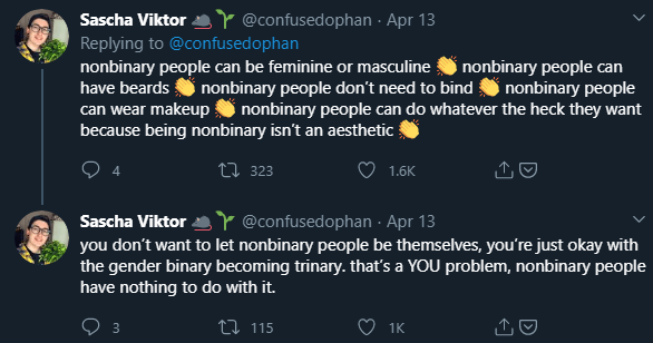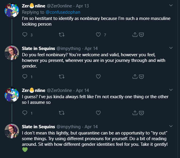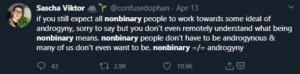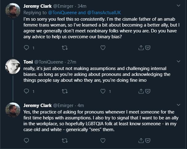 I’ve collected tweets from non binary folk and shared them below. They say so much more than I can. The last panel asks how to be a better ally to NB folks. So much comes back to the two things I always say as a take-away when I’ve presented on trans issues : Never Assume and Don’t be Afraid to Ask Respectful Questions.