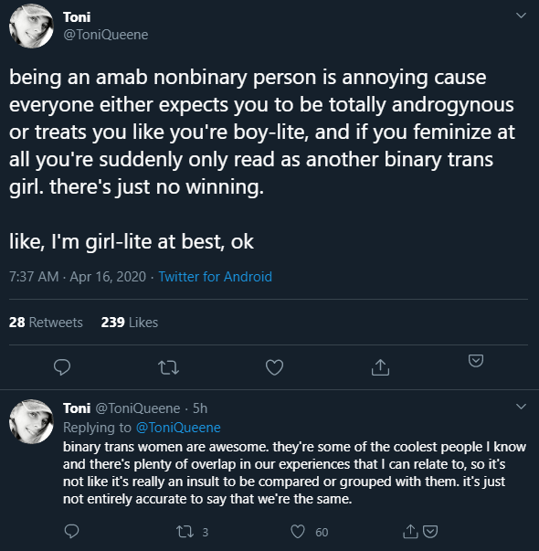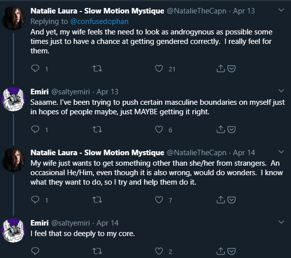 I have to admit, I am challenged by the non binary as well – I’ve always identified as binary. I’m trans and binary. I’ve never doubted I’m male. When I was growing up, I ‘passed’ as male more often than not, but I was androgynous. I hated being stuck in that mode. (Of course, non binary wasn’t even a consideration then, and the only trans were transsexuals. You had to have surgery first). I didn’t like living in between. My integrity as a person, what makes me feel whole, also lines up with being male. However, that doesn’t mean that I embrace all of the stereotypes that go with being male; I’m just me – but I do like that he/his set of identifiers.